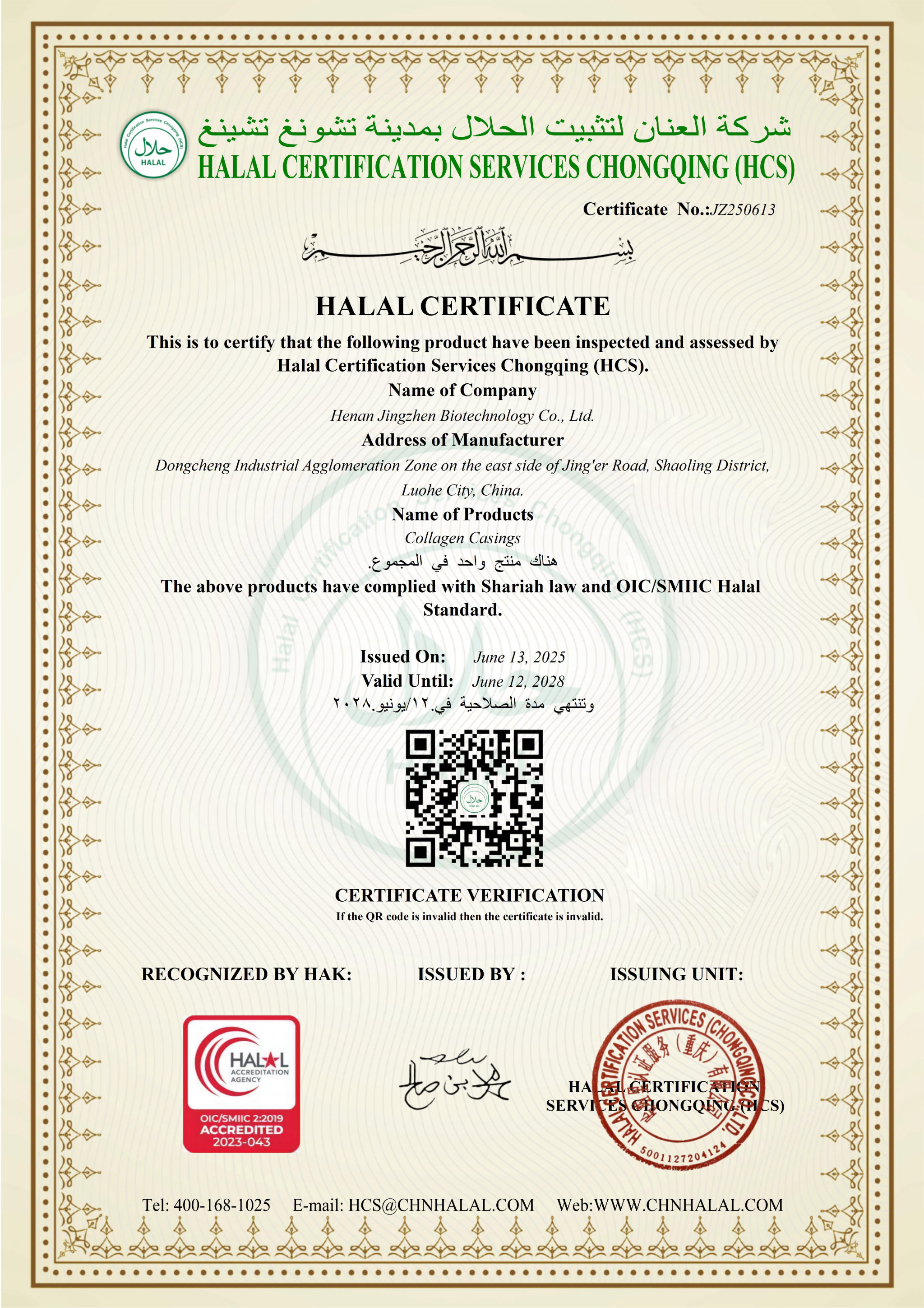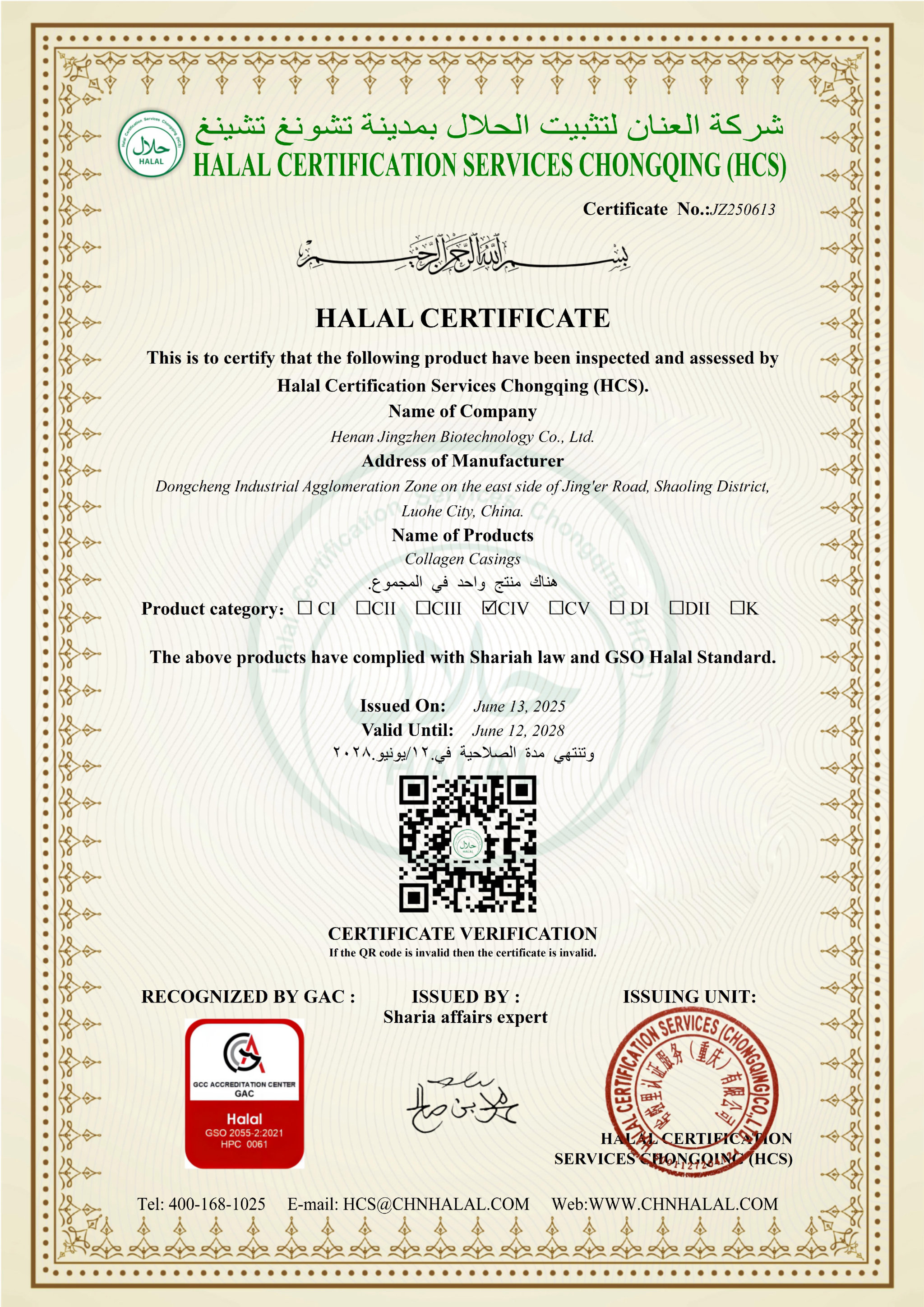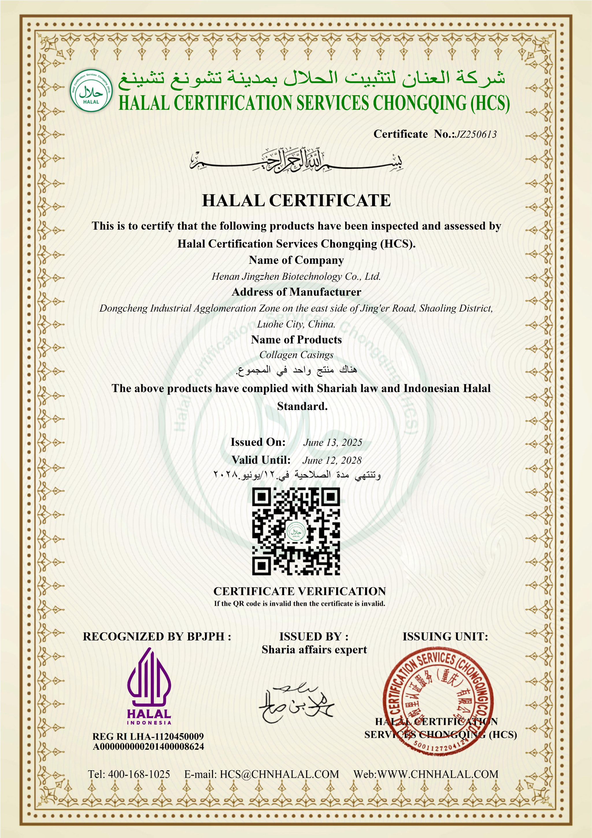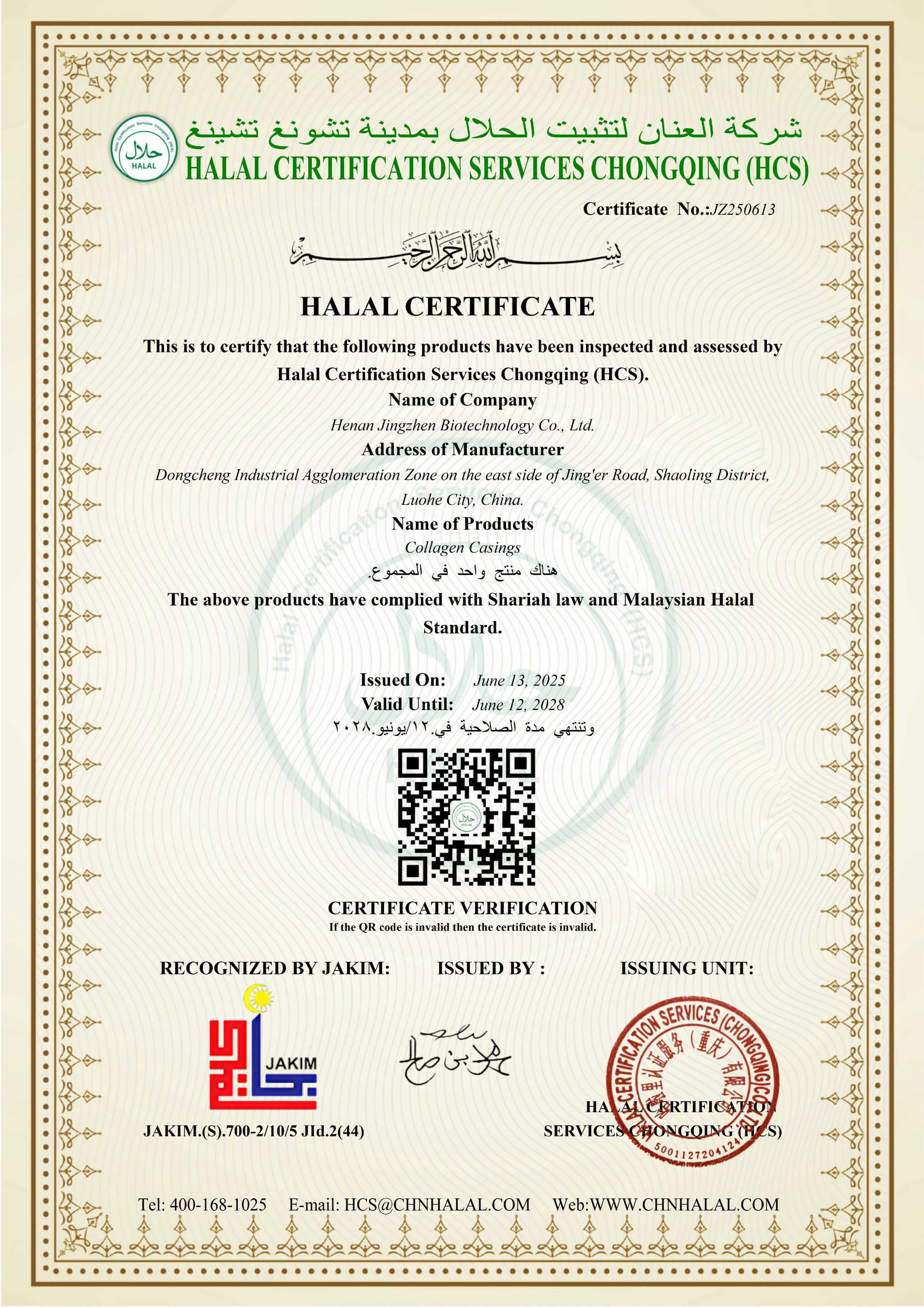 Our products are made primarily from collagen extracted from bovine hide, through a special process that ensures excellent compatibility with modern high-speed filling machines. We adhere to national food safety standards (GB 14967-2015) and hold multiple international certifications, including ISO 9001, ISO 14001, ISO 22000, and HALAL certifications recognized by BPJPH (Indonesia), GAC (Gulf Cooperation Council), HAK (OIC/SMIIC), and JAKIM (Malaysia), ensuring our products meet global quality and religious compliance requirements.