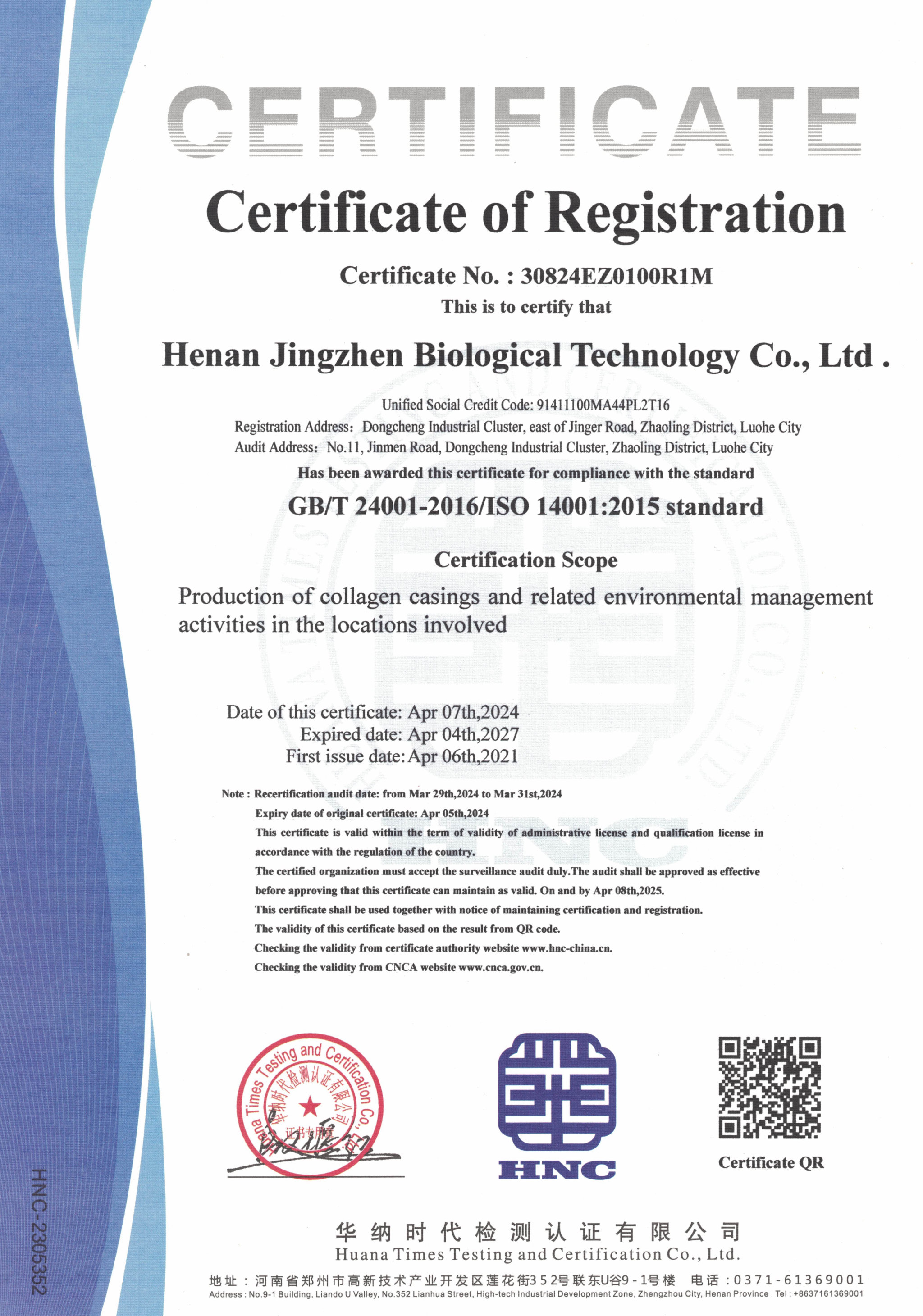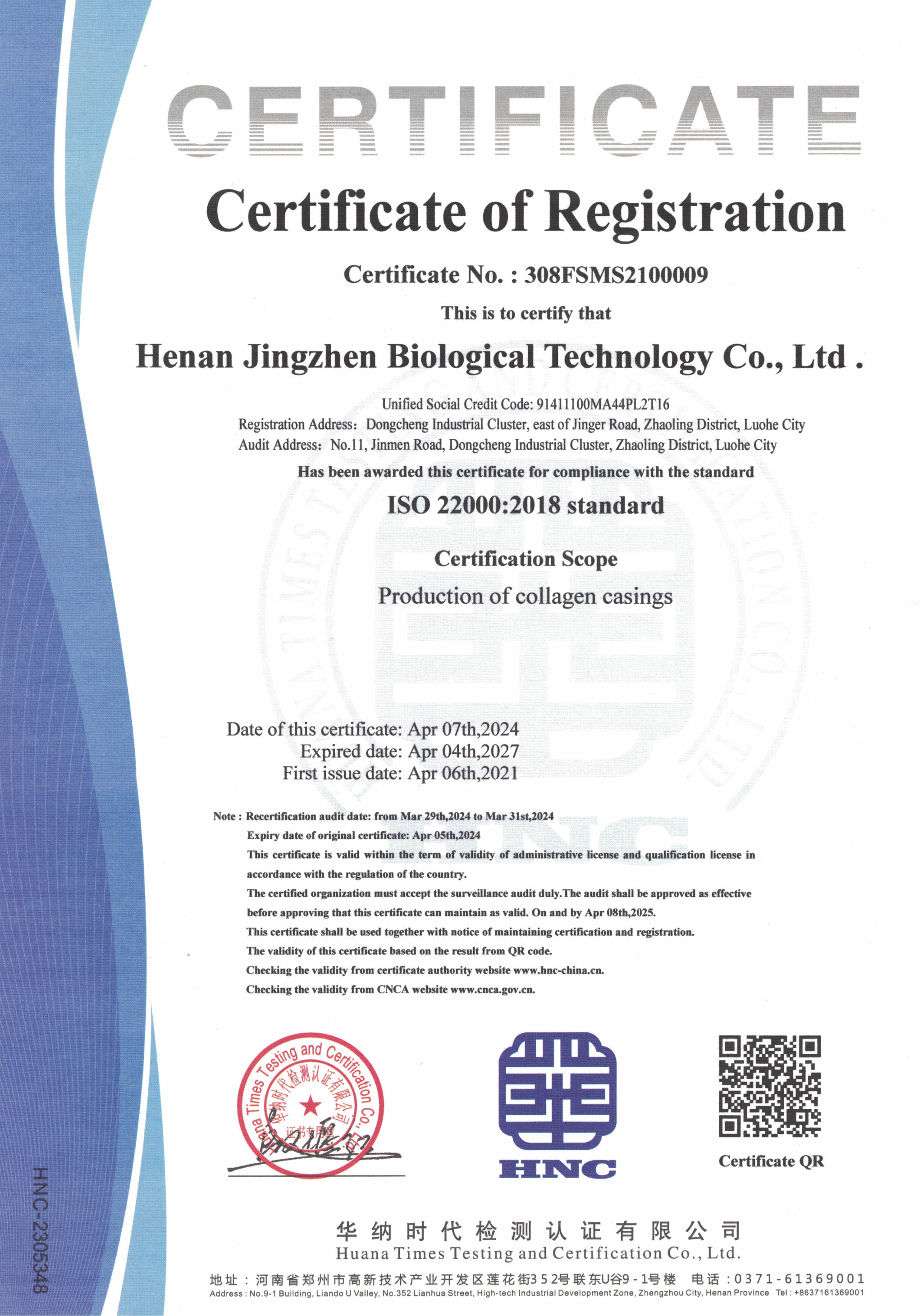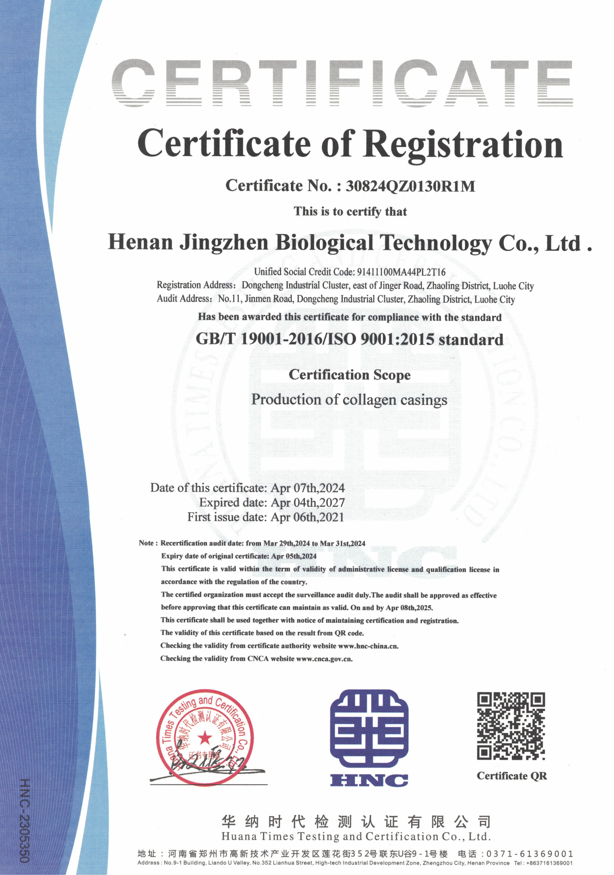 Committed to sustainable and responsible manufacturing, Henan Jingzhen Biotechnology implements comprehensive management systems to guarantee product safety, environmental protection, and customer satisfaction. Our collagen casings are characterized by uniform color, seamless structure, and reliable performance, suitable for cooking, smoking, and various sausage applications.